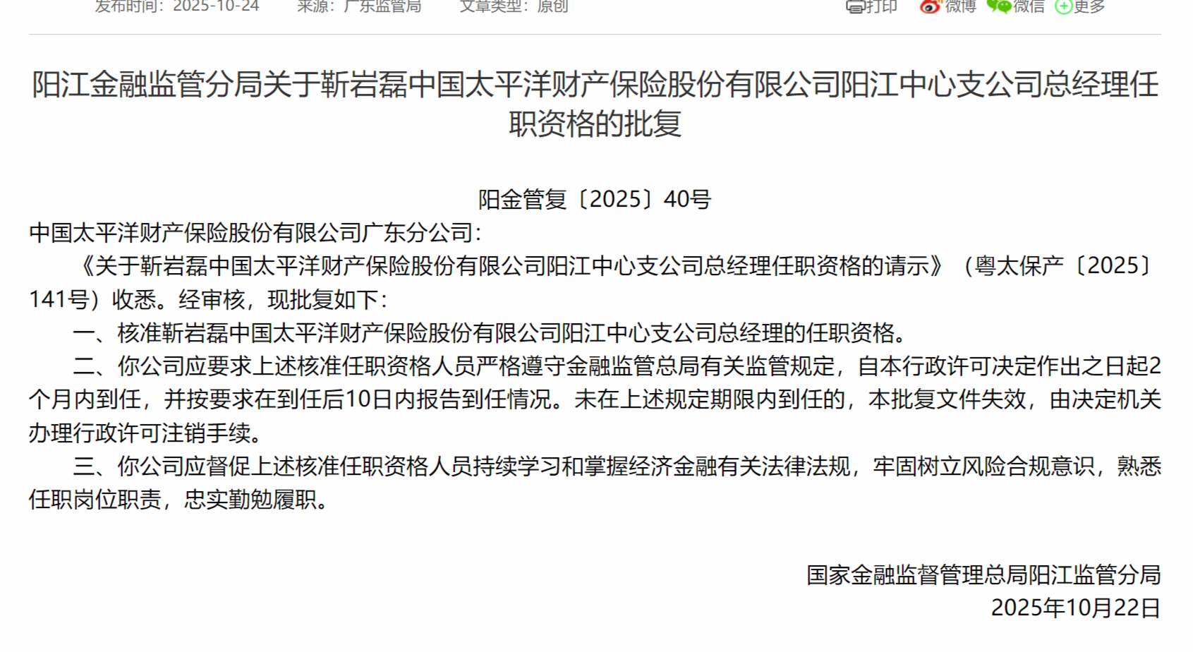 10月24日,阳江金融监管分局发布关于靳岩磊中国太平洋财产保险股份有限公司阳江中心支公司总经理任职资格的批复,核准靳岩磊中国太平洋财产保险股份有限公司阳江中心支公司总经理的任职资格。